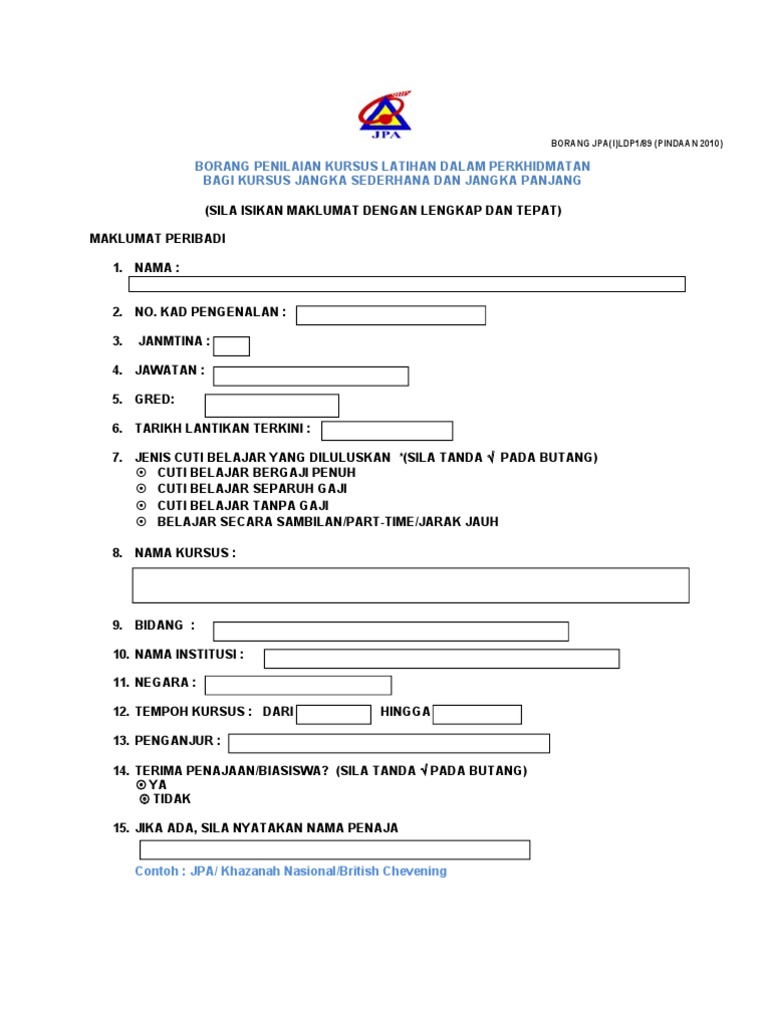 Ketua Setiausaha kementerian Datuk Seri Dr. Mengurus dan menjilid laporan- laporan kursus setelah pegawai tamat menjalani latihan kursus di luar negara Borang Laporan Penilaian Keberkesanan Kursus Jangka Dalam dan Luar Negara. Bagaimanakah kaedah bayaran yuran kursus dilaksanakan.
