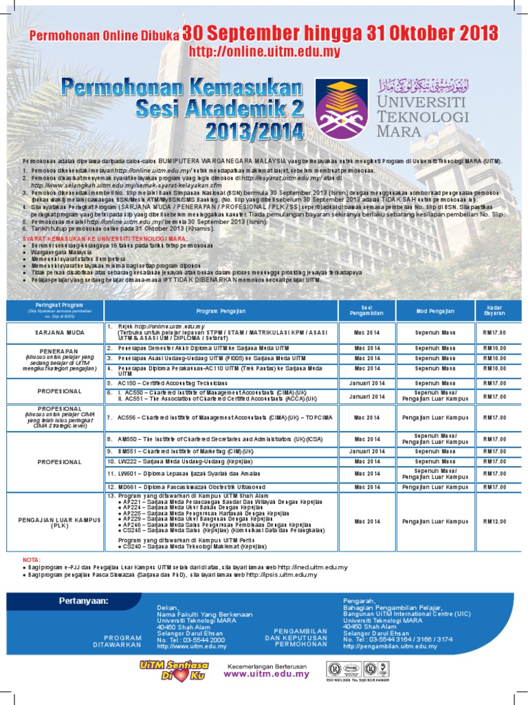 Yuran sarajan mengikut kos di uitm. Sepatutnya UiTM kena wujudkan 1 page umum untuk mereka yang bakal melangkah ke alam menara gading sentiasa mengemaskini page tersebut untuk pelajar yang ingin melanjutkan pelajaran ke sini. UiTM - Universiti Teknologi Mara Kuala lumpur adalah universiti terkemuka di Malaysia. Bayaran perlu dibuat secara atas talian melalui Sistem Pengambilan Pelajar iCEPS.