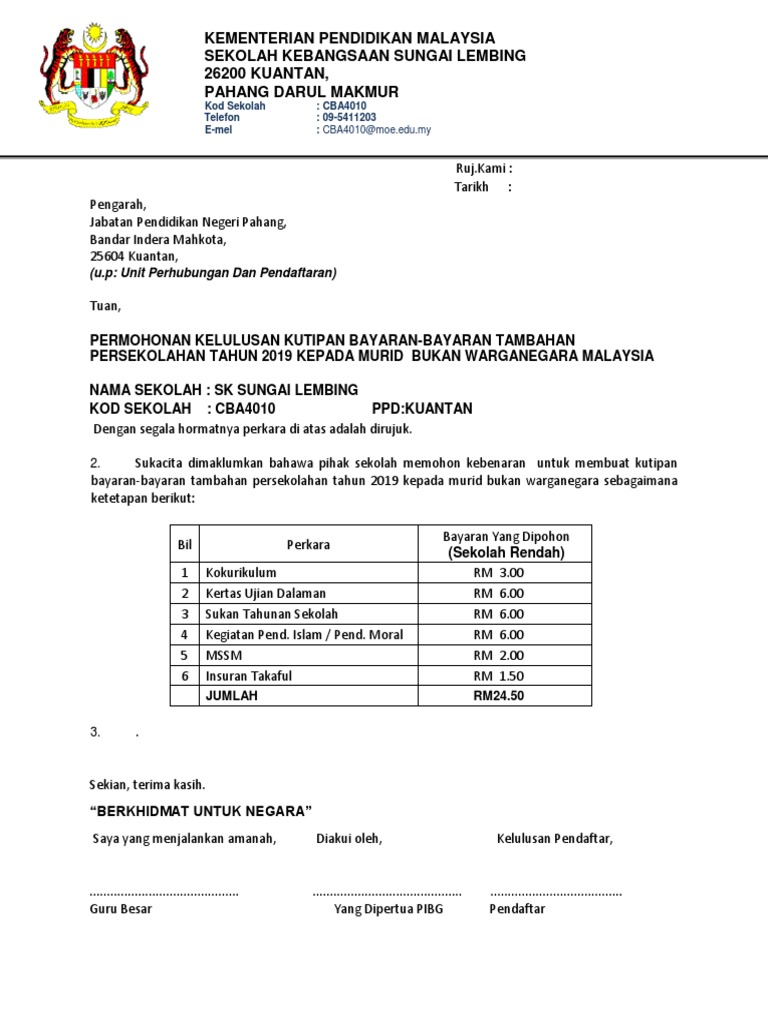 Pengguna boleh terus mencetak resit tidak perlu menulis lagi Serahan yang lengkap dan kemas - Serahan kutipan yuran boleh dilakukan dengan mudah. Contoh Format Surat Permohonan Kutipan Bayaran Tambahan 2012 Murid Bukan Warganegara. 81 Yuran.