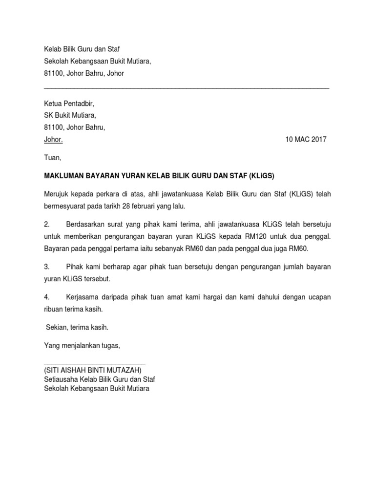 Adalah dimaklumkan bahawa Mesyuarat Eksekutif Pengakap Negara bilangan 022017 yang telah bersidang pada 16 Disember 2017 dan Surat Bayaran Pendaftaran dan Yuran Keahlian daripada Jabatan Pendidikan Negeri Sembilan JPNSSPPKKOKO900-31 Jld8 7 yang bertarikh 29 Januari 2018 telah memutuskan kenaikan dan kutipan Yuran Pendaftaran. 1083 total views 1 views today. Surat makluman pembayaran yuran tahunan sek ren agama integrasi taman keramat facebook 86554280 contoh format surat permohonan kutipan bayaran tambahan 2012 surat bayaran yuran persatuan ibu bapa dan guru Langkau ke bahagian di halaman ini contoh format surat permohonan kutipan.